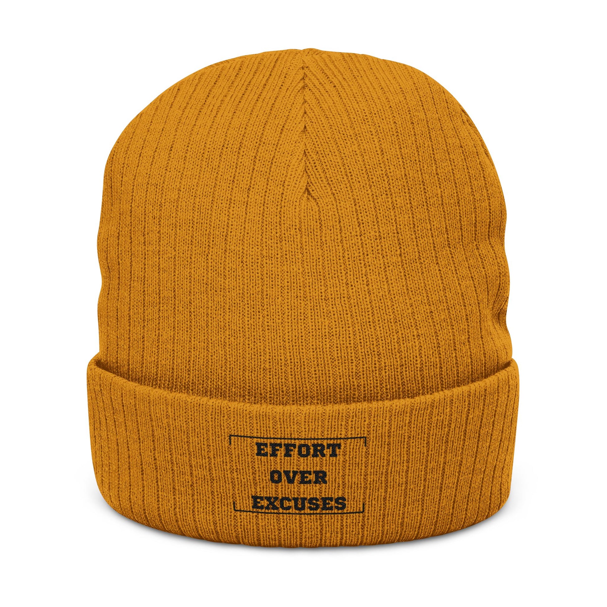 Soft ribbed knit hugging your head with quiet confidence. This cuffed beanie slips on easily and keeps warmth locked in with its double-layer construction, while the simple embroidered patch — small, bold lettering that reads “EFFORT OVER EXCUSES” — adds a subtle, motivational edge. The neutral sand tone and clean rib texture make it easy to pair with rugged jackets, layered streetwear, or weekend workout gear. Wear it on early runs, commute days, or when you need a little extra focus; it feels like a steady, practical reminder to keep showing up.