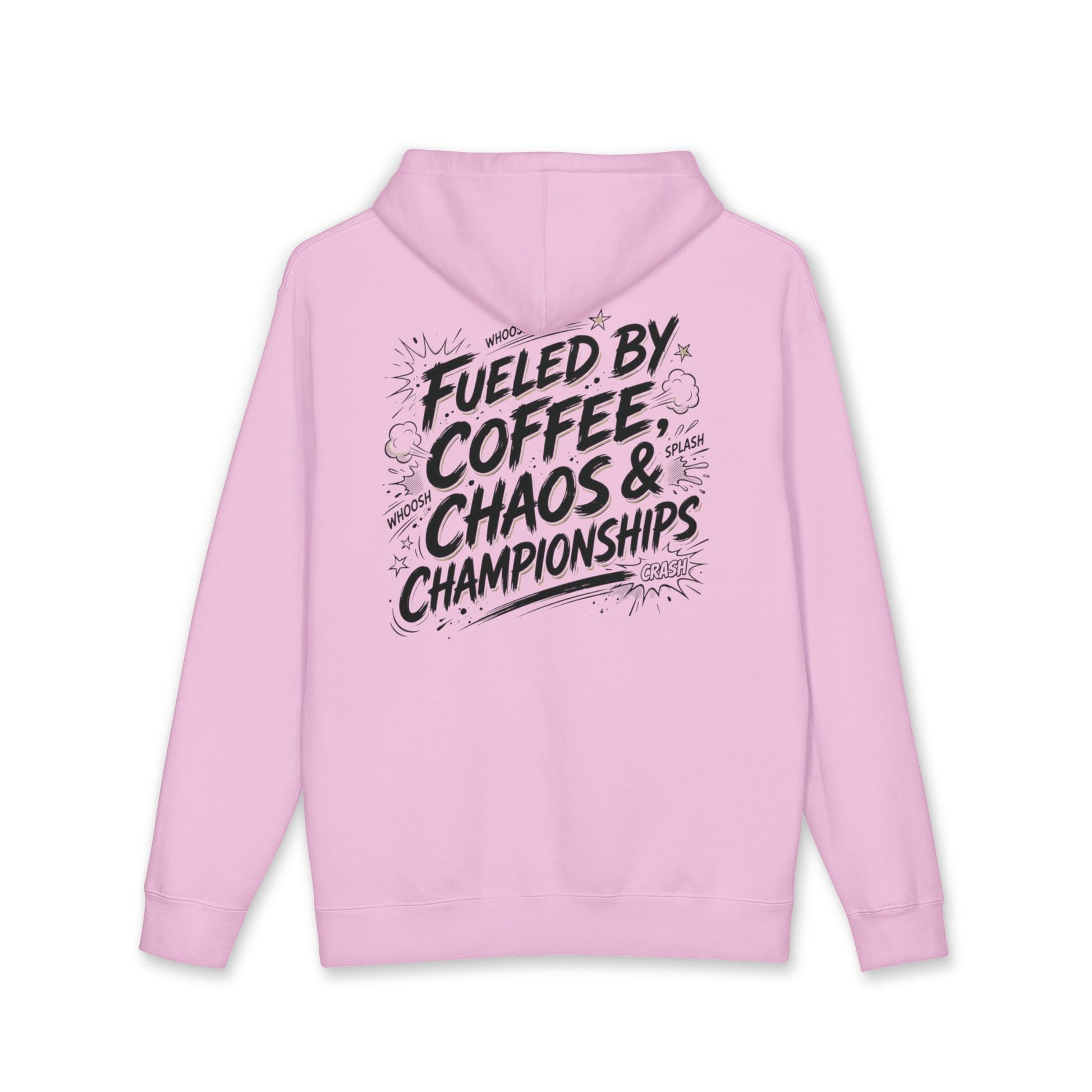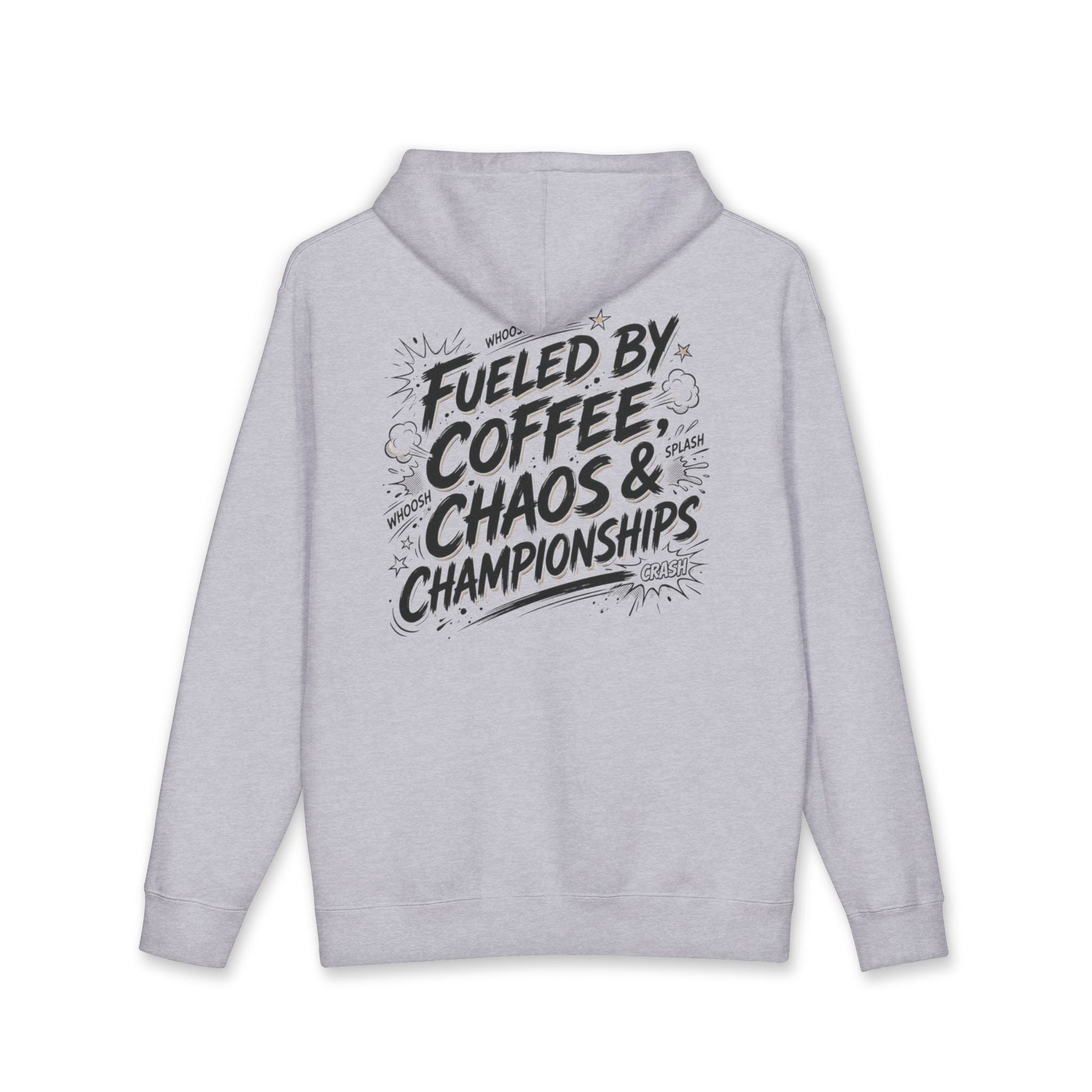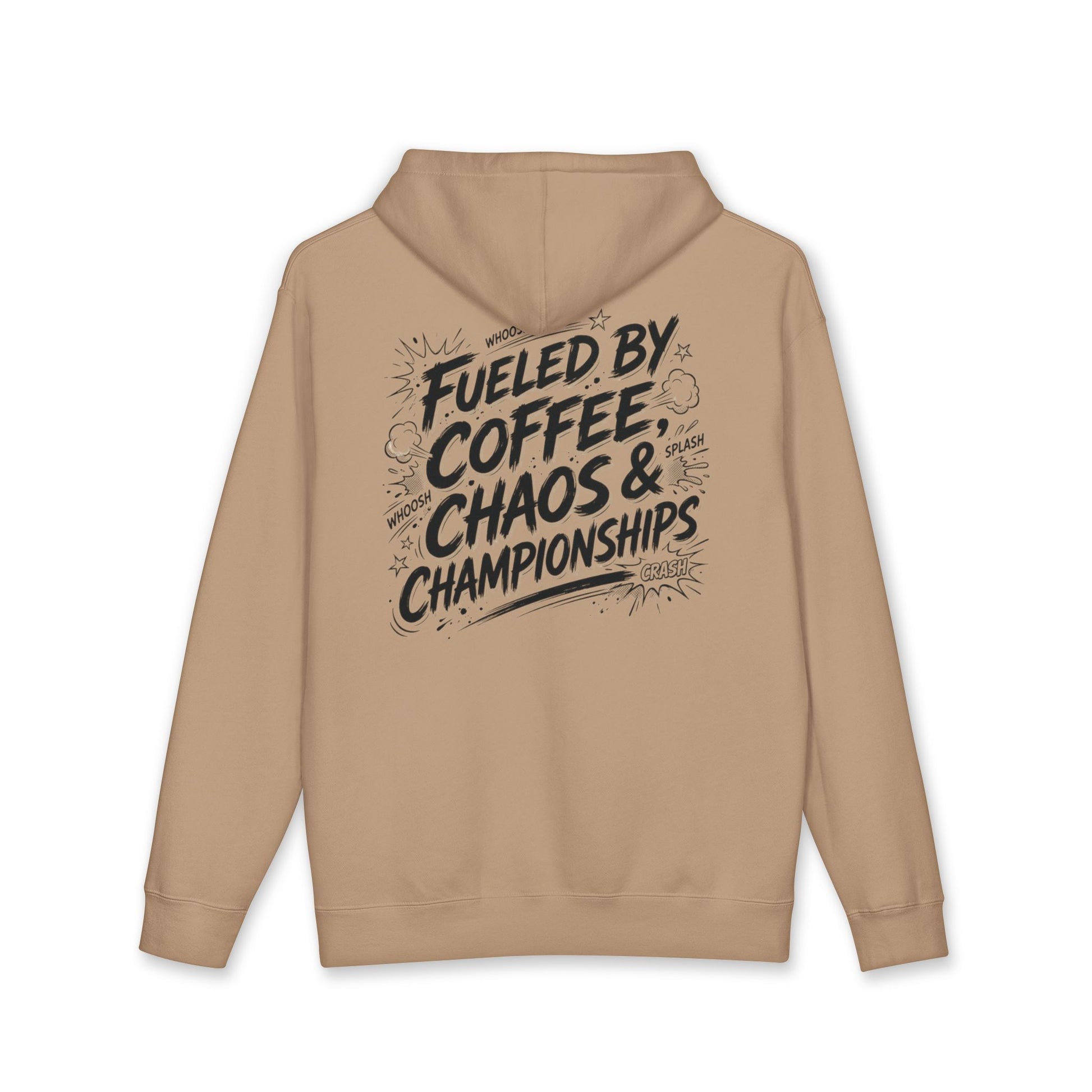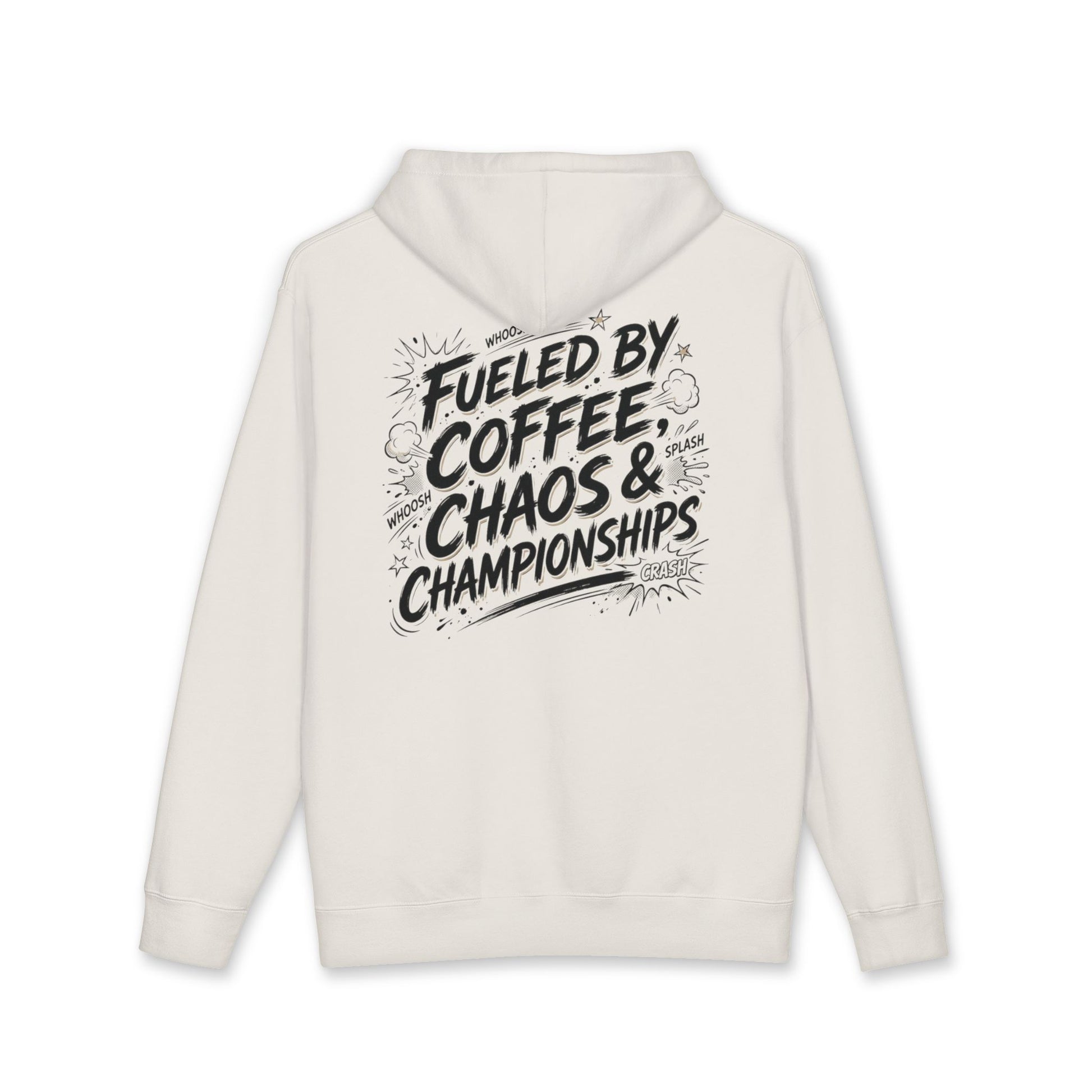 This heavyweight hooded sweatshirt wraps you in a quiet kind of confidence. Thick, fleece-lined fabric holds in warmth while the relaxed cut leaves room for movement — whether you’re chasing deadlines, practicing drills, or grabbing a late-night coffee. The front bears a subtle emblem; the back sports bold hand-lettered art that reads “Fueled by Coffee, Chaos & Championships,” a line that feels like your inner monologue turned into a rallying cry. It’s sturdy where you need it and soft where you want it: reinforced seams, ribbed cuffs, and a tag-free neckline keep distractions low so you can focus on what matters. Wear it to early morning practices, streamed team meetings, or long travel days — it layers easily and ages with character.